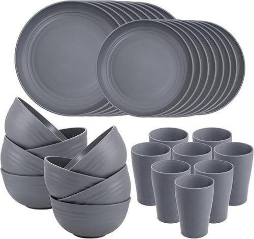 32pcs Wheat Straw Dinnerware Sets,Unbreakable Dinnerware Sets for 8,Reusable Tableware,Dishes Set for 8,Plates and Bowls Set Dark Grey Include16pcs Plates, 8pcs Bowls, 8pcs Cups